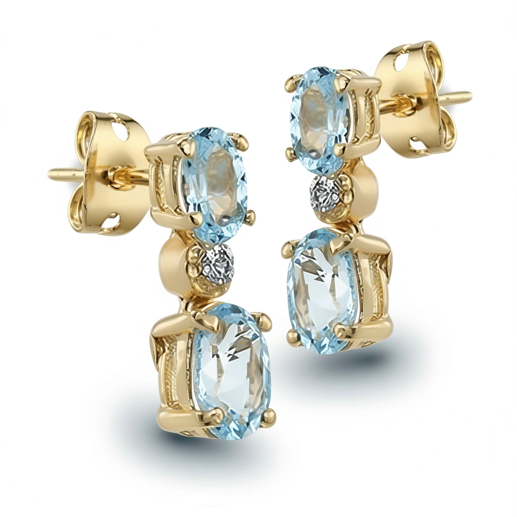 The Azure Gleam Earrings combine 3.00 CTW AA-grade Swiss Blue Topaz with delicate round-cut diamonds (0.01 CTW, SI2 clarity) for a refined, eye-catching sparkle. Expertly crafted in solid sterling silver and plated with 18K yellow gold, these designer earrings offer both durability and sophisticated style.