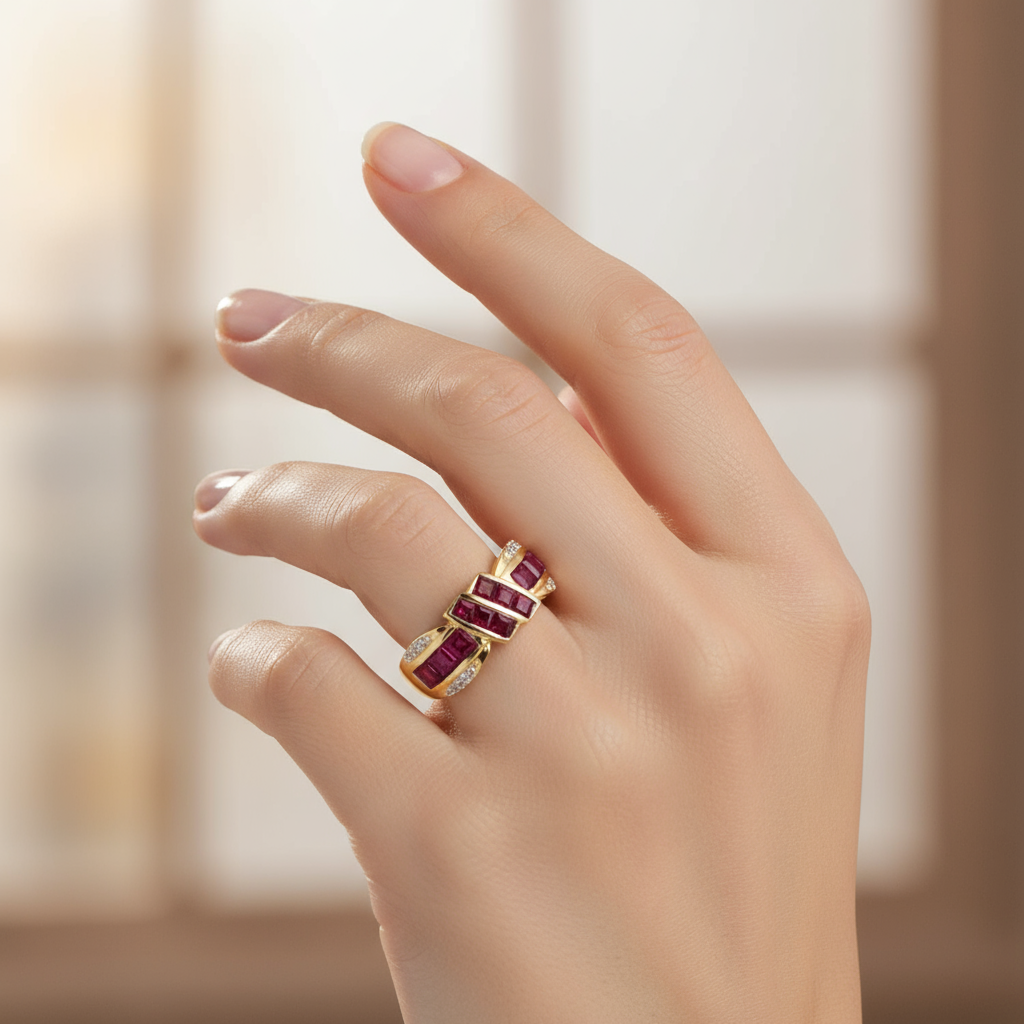 Embrace the allure of timeless sophistication with the Crimson Majesty Ring. This designer piece features a vibrant emerald-cut 2.50 CTW AAA-grade ruby, accentuated by 12 sparkling round-cut I1 diamonds (0.060 CTW).