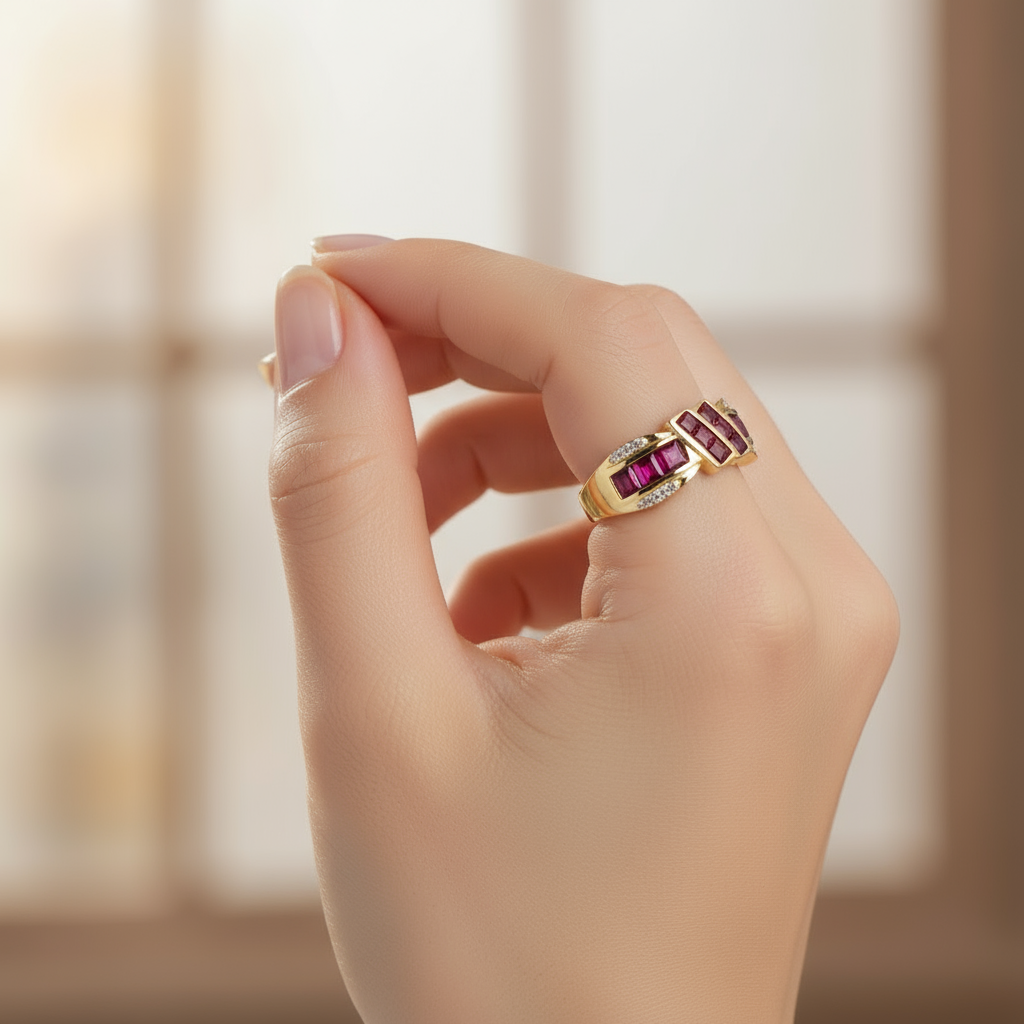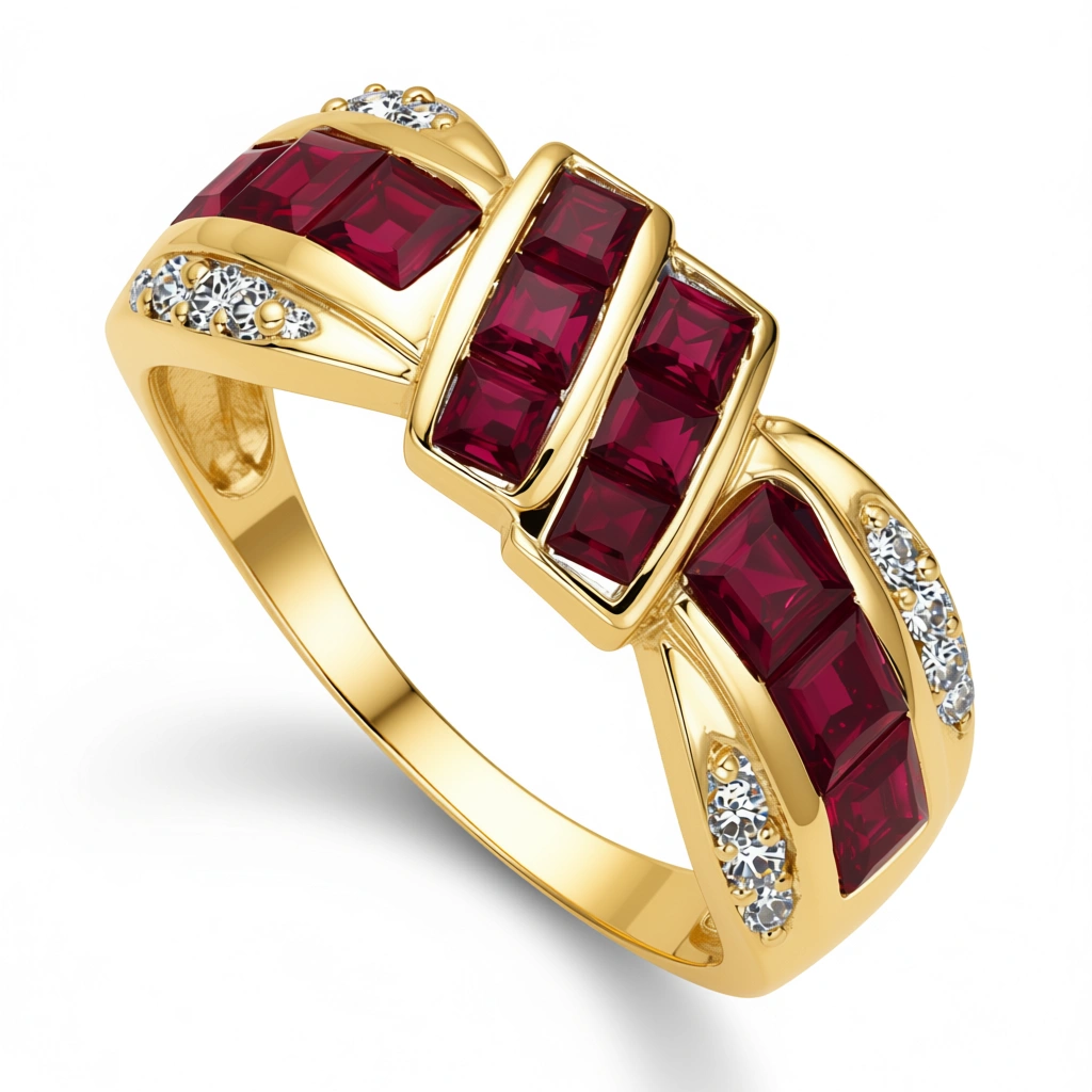 The Crimson Majesty Ring radiates elegance with its AAA-grade 2.50 CTW ruby and 12 dazzling diamonds. Set in 14K yellow gold over solid sterling silver, it’s a perfect harmony of luxury and strength.