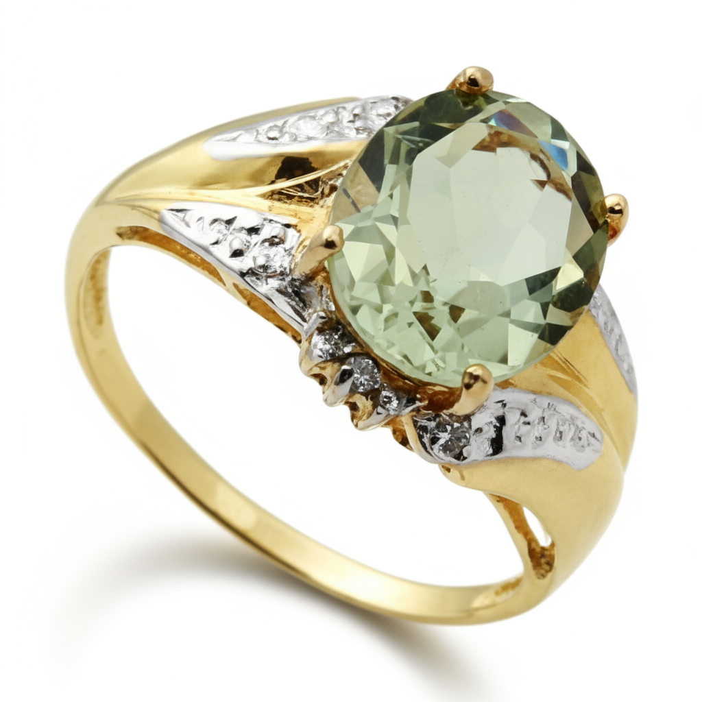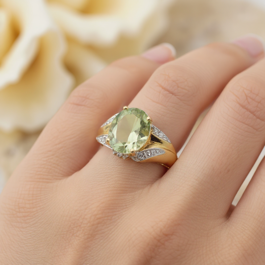 A captivating green amethyst and diamond ring crafted in 14K yellow gold over sterling silver, radiating elegance and a hint of natural luxury — perfect for sophisticated women.