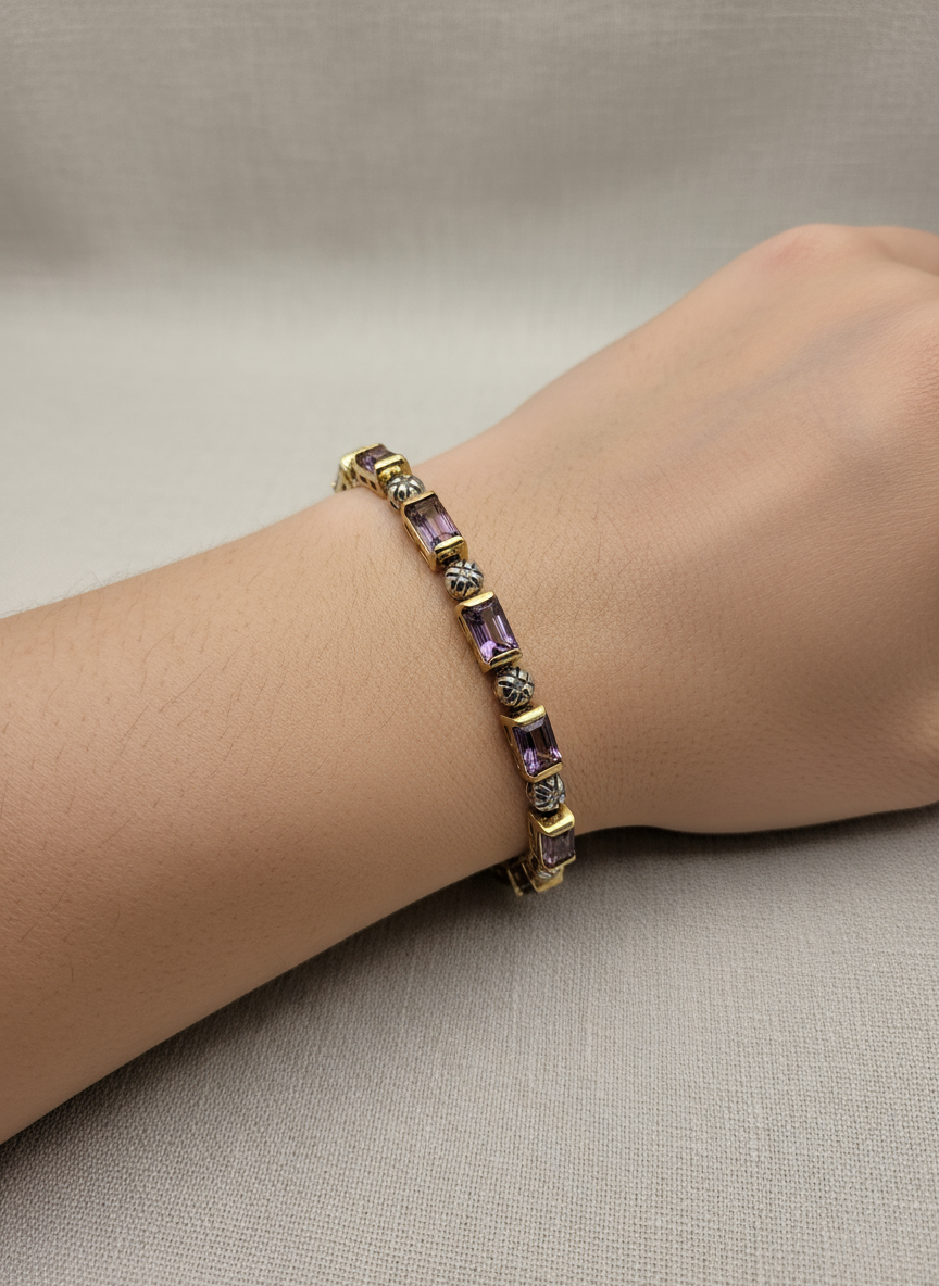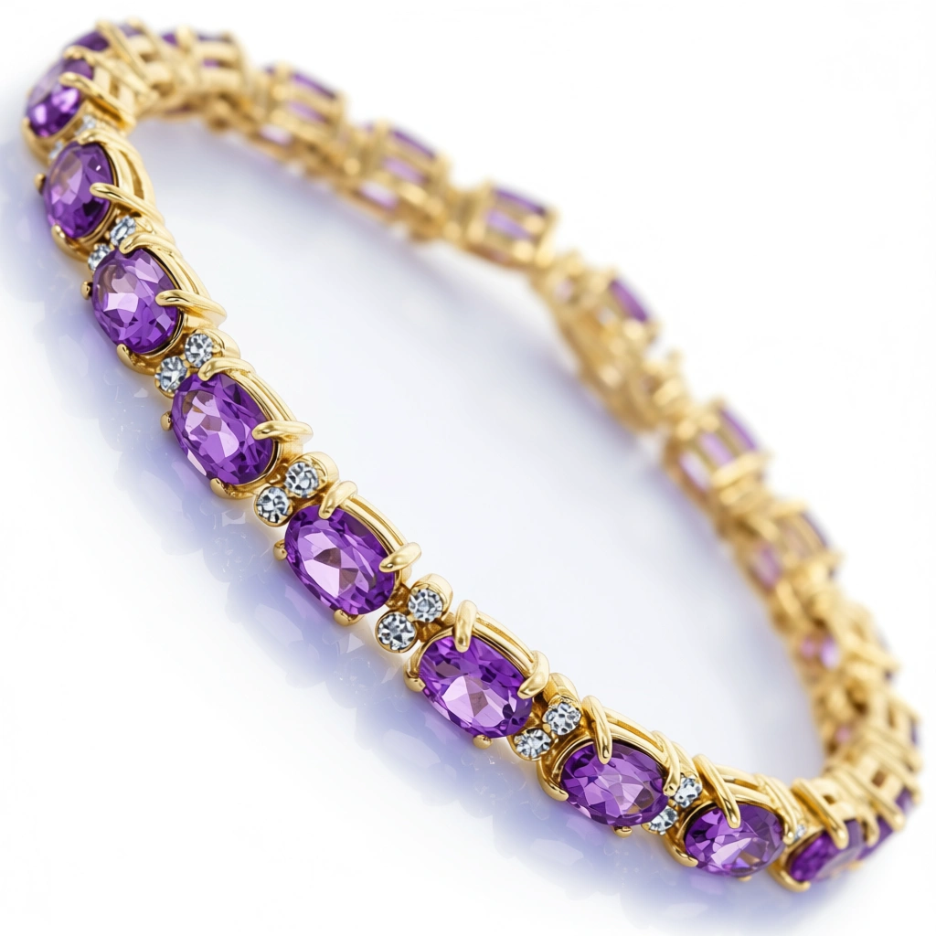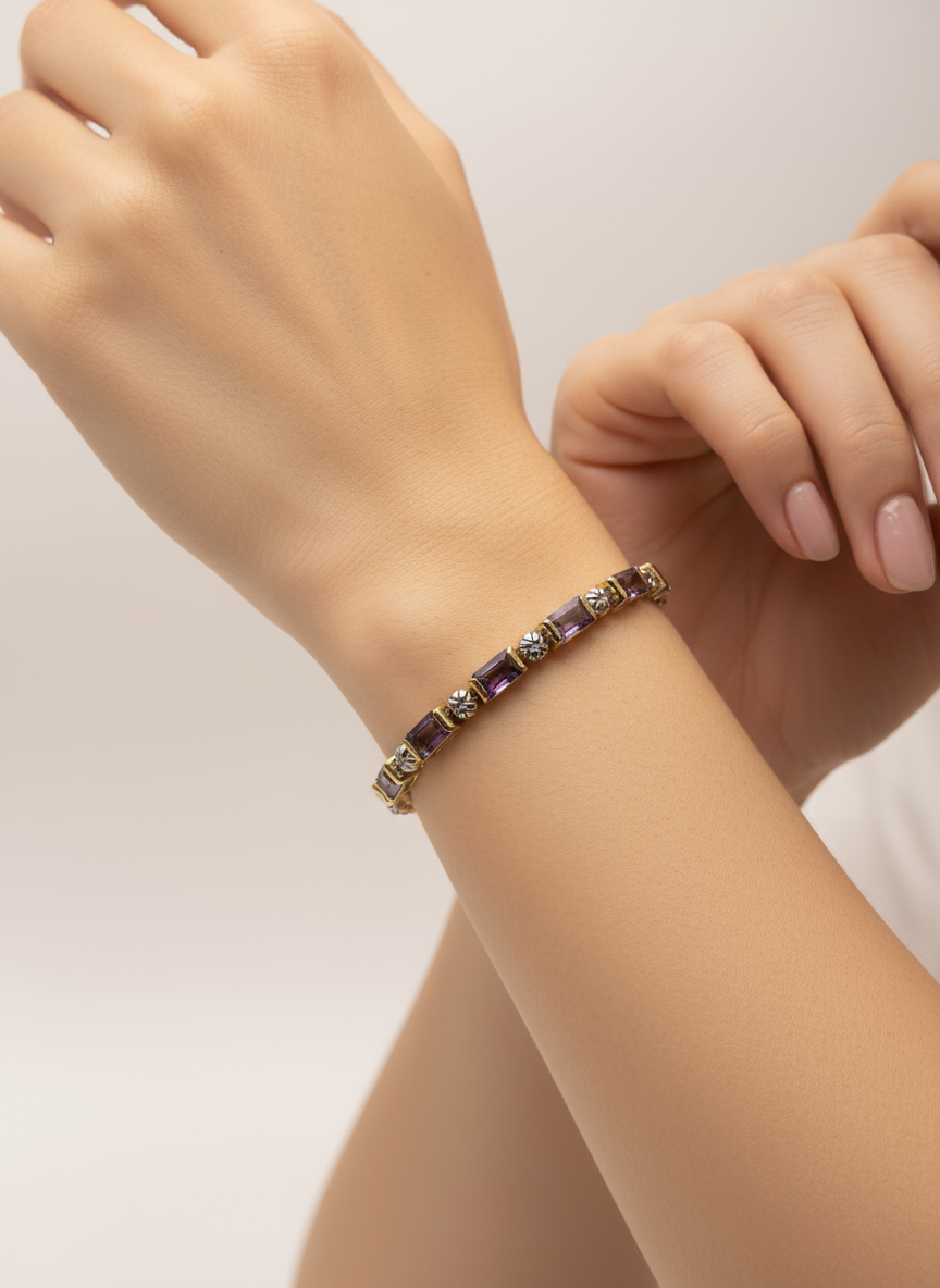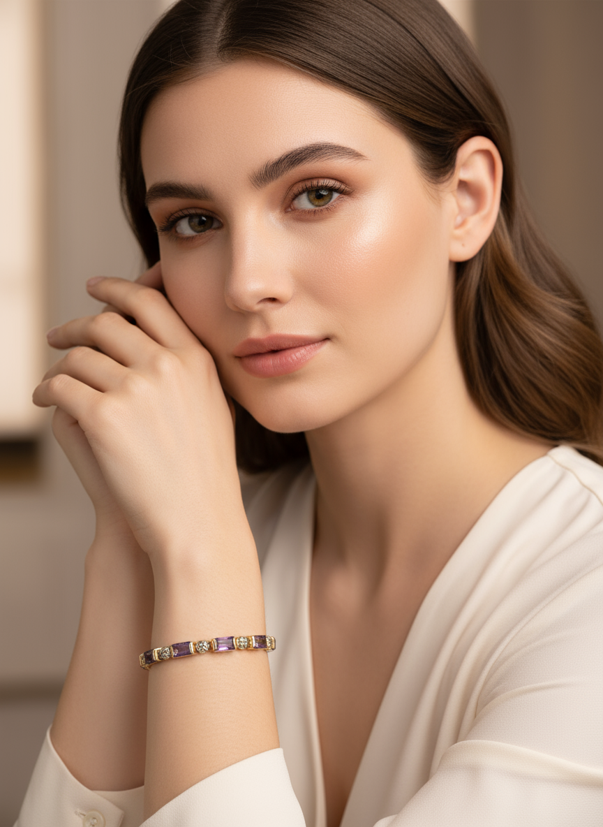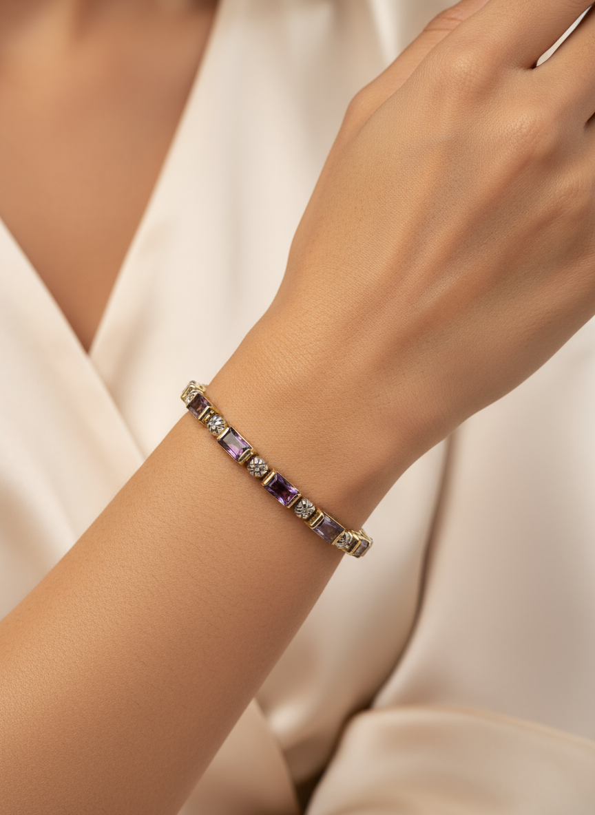 Embrace royal radiance with the Violet Empress Amethyst Bracelet  a breathtaking fusion of 15.25 CTW oval-cut Amethysts and brilliant accent diamonds, elegantly set in 18K yellow gold over solid sterling silver. Designed for the modern woman who moves with grace and confidence.